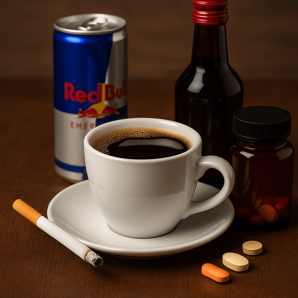 Kofeinas šituose deriniuose dažnai vaidina nekaltą figūrą – atrodo, kad viską galima nurašyti jam: drebulys, nemiga, daužosi širdis lyg išprotėjusi. Visi supranta, kas yra „persistengiau su kava“, bet retai kas klausia, ar prie kavos dar buvo „papildų“. Kitaip tariant, pats legalus puodelis neretai tampa patogia uždanga, už kurios gali pasislėpti daug rimtesni draugeliai.