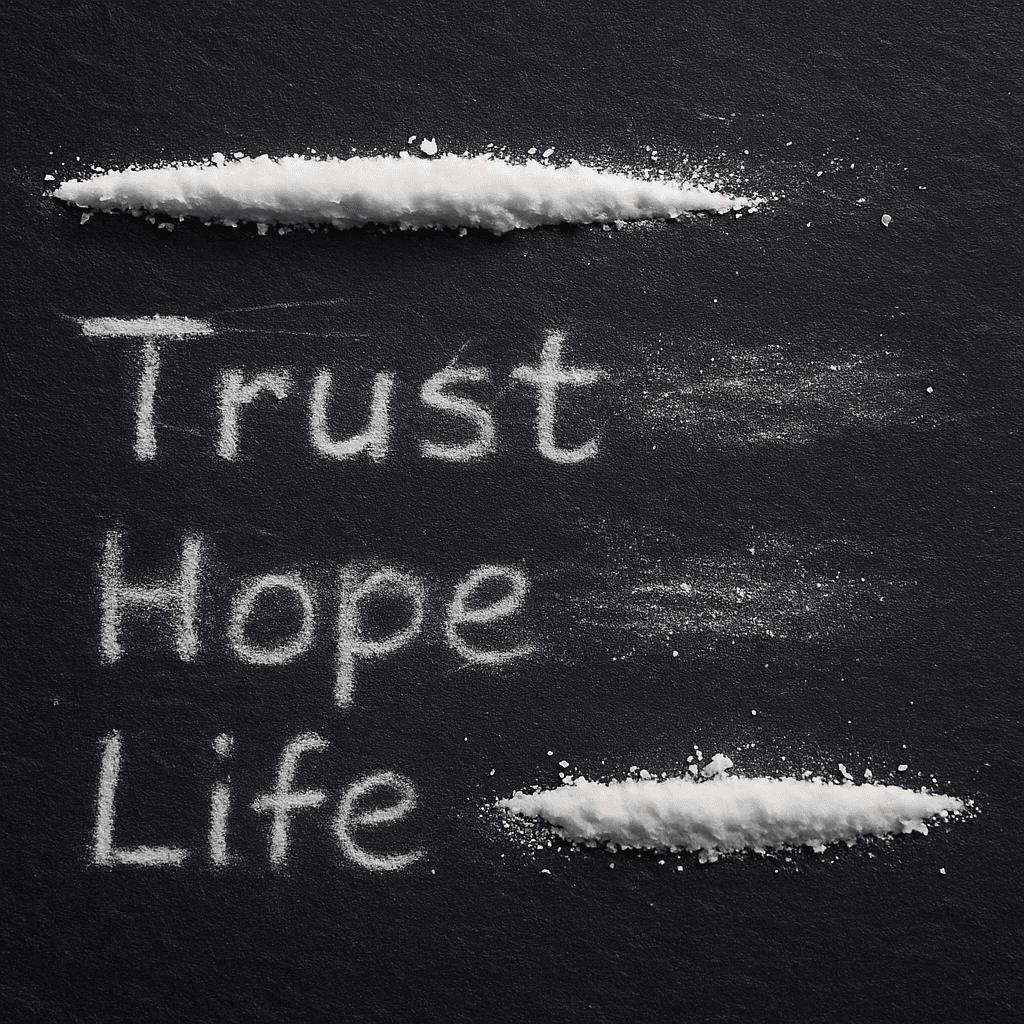 Baltos linijos ant juodo paviršiaus primena pasirinkimus, kuriuos naikina priklausomybė. Nėra kelio atgal – tik iliuzija, kuri galiausiai sugriauna viską, ką žmogus turėjo.
