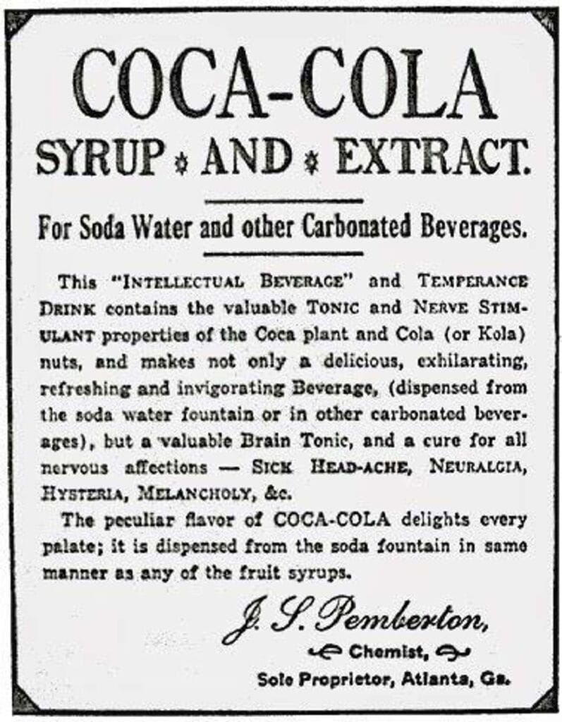 Originali 1886 metų Coca-Cola reklama, kurioje giriamos tonizuojančios kokamedžio savybės. Gėrimas buvo pristatomas kaip „smegenų tonikas“ ir nervų sistemą stimuliuojantis preparatas.