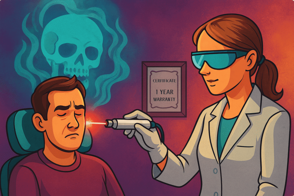 Skamba kaip mokslas, atrodo kaip medicina, bet realybėje – tai vos ne šiuolaikinis šamanizmas su baltu chalatu. Ne, tau niekas neaiškins priklausomybės mechanizmų, nepadės keisti mąstymo ar elgesio modelių. Vietoj to – spindulys į ausį, ir viskas, tu jau „užsikodavai“. Sertifikatas pakabintas, „vienų metų garantija“ įrėminta, o tu – išleistas laimingas, su iliuzija, kad rūkymas sustabdytas lazeriu.