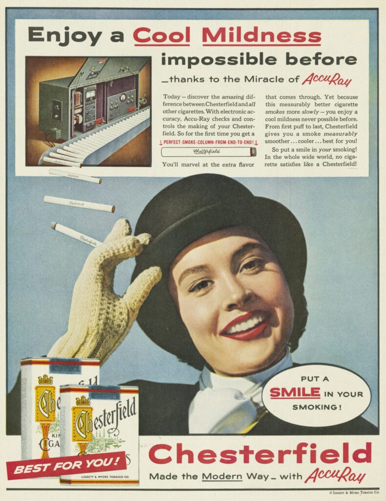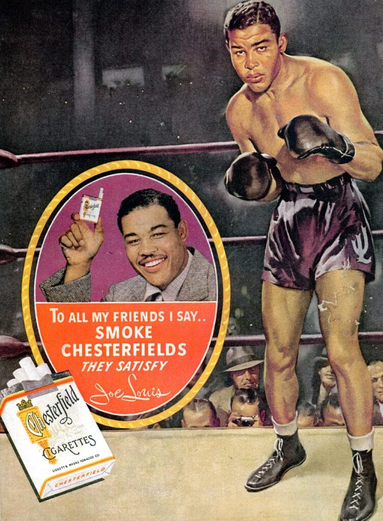 Legendinis boksininkas Joe Louis – ringe nepalaužiamas, bet nuo „Chesterfield“ smūgių apsiginti pamiršo. Ši reklama – tobula iliustracija, kaip net sporto dievai buvo naudojami, kad nikotino vergovė atrodytų kaip pergalė. Jei jis rūkė, nors stipriai tuo abejoju – tai turbūt ir tau padės, tiesa? Tik klausimas – kovai su kuo?